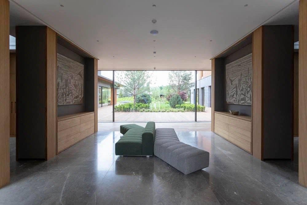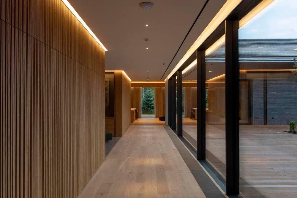 Лобби сменяется просторным холлом, ведущим в столовую и кинозал. Столовая выходит на общую террасу. Справа— гостевые, слева — большая гостиная и каминный зал с библиотекой.