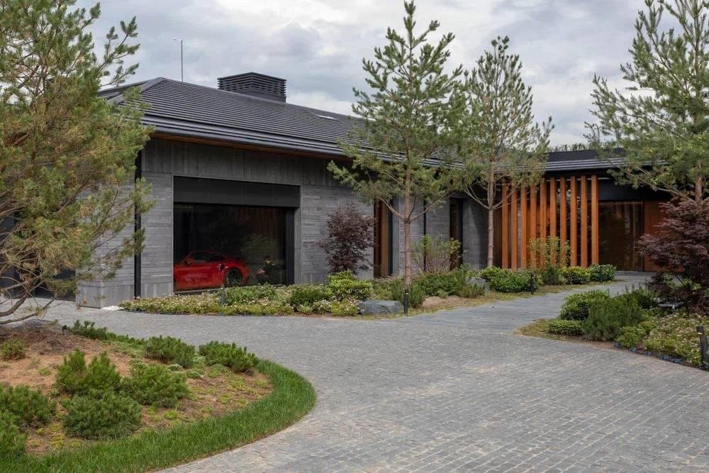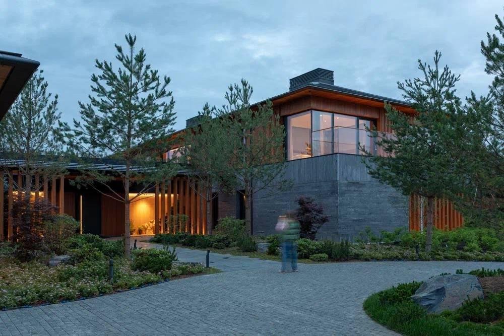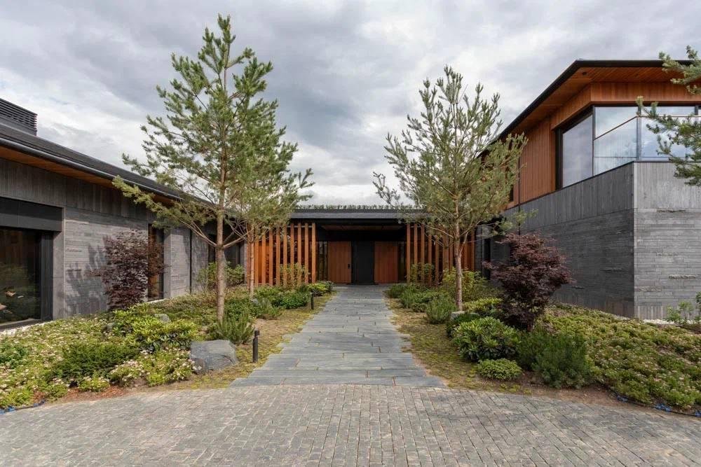 Виллы представляет собой двухуровневое здание, соединенное одноэтажным переходом с парадным холлом, ориентированным на бульвар, и внутренним двориком с видом на сад и окружающий природный ландшафт.