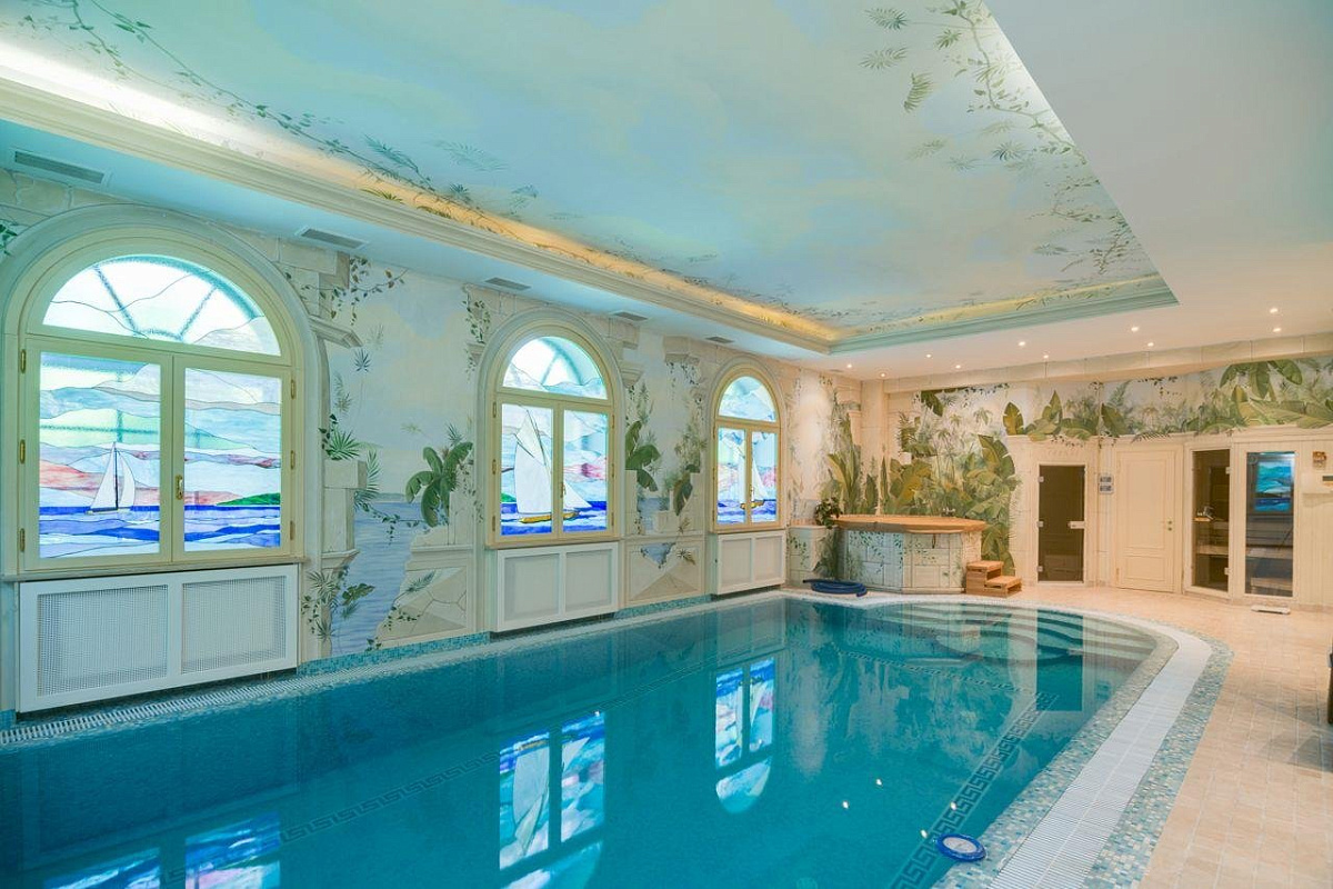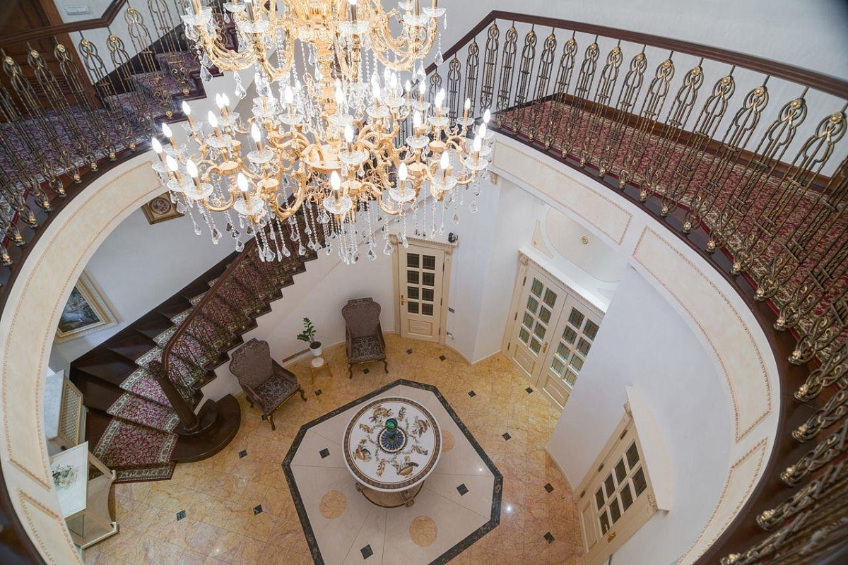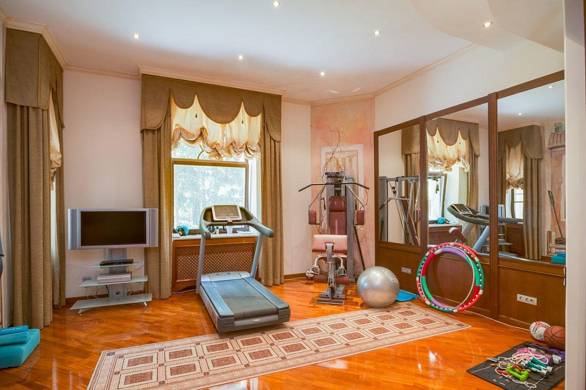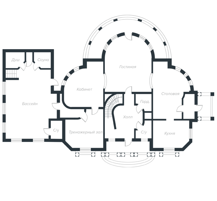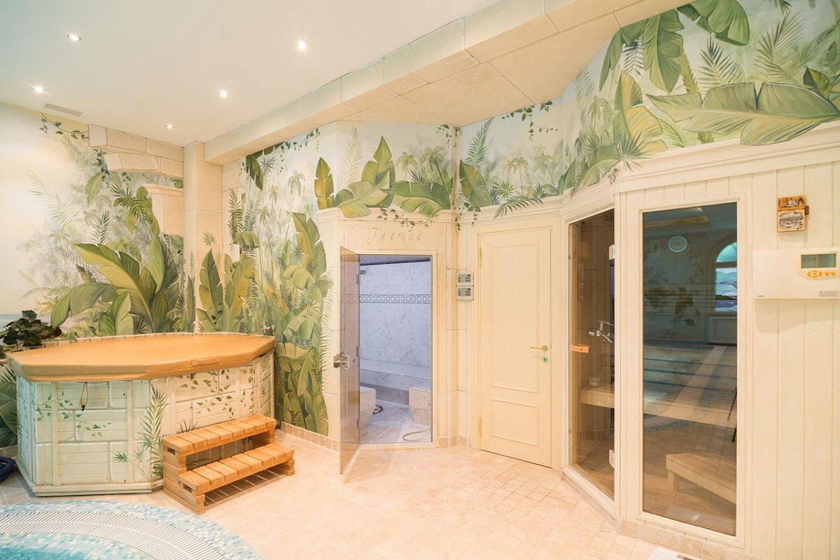 1 этаж: прихожая, холл, 2 гардеробные, гостевой с/у, гостиная с камином, кабинет с выходом на террасу, столовая, кухня, кладовая, постирочная, СПА-зона: бассейн, хаммам, джакузи, сауна, с/у, душевая, тренажерный зал.
