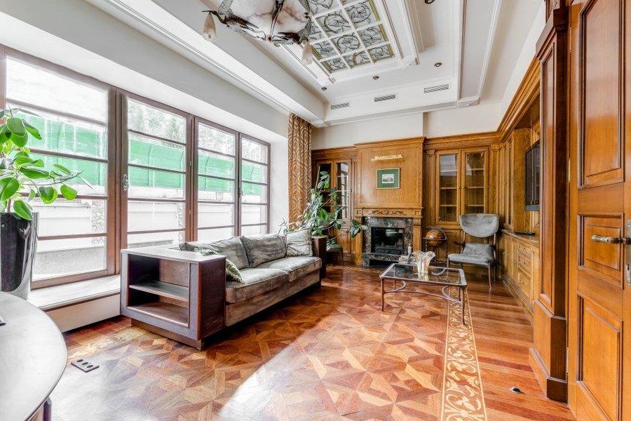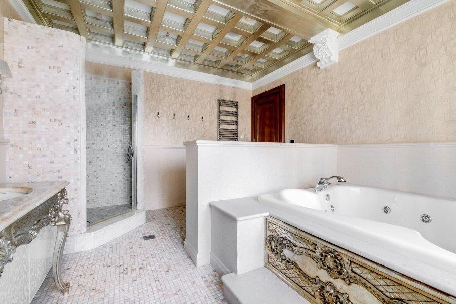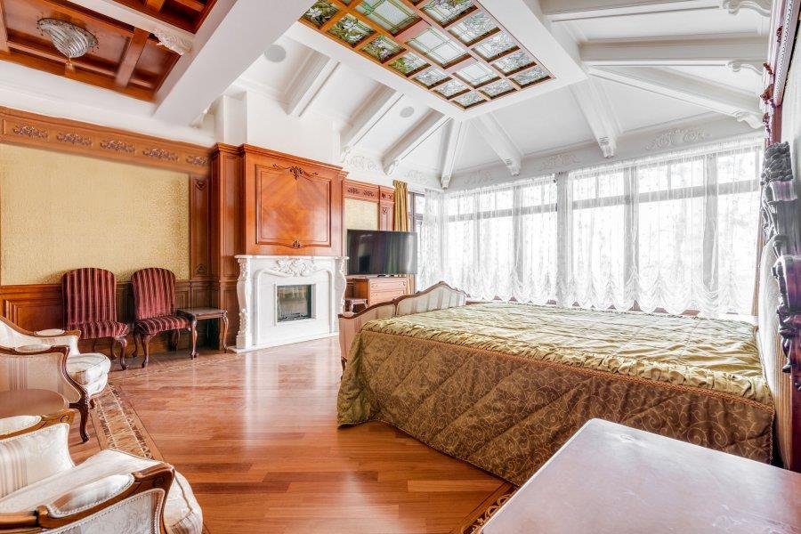 2 этаж: холл, спальня, ванная комната (гидромассажная ванна и душевая кабина), спортзал, двусветная библиотека, спальня с ванной комнатой (гидромассажная ванна и душевая кабина) и гардеробной, мастер-спальня с выходом на террасу, камином, гардеробной и ванной комнатой (гидромассажная ванна и душевая кабина).