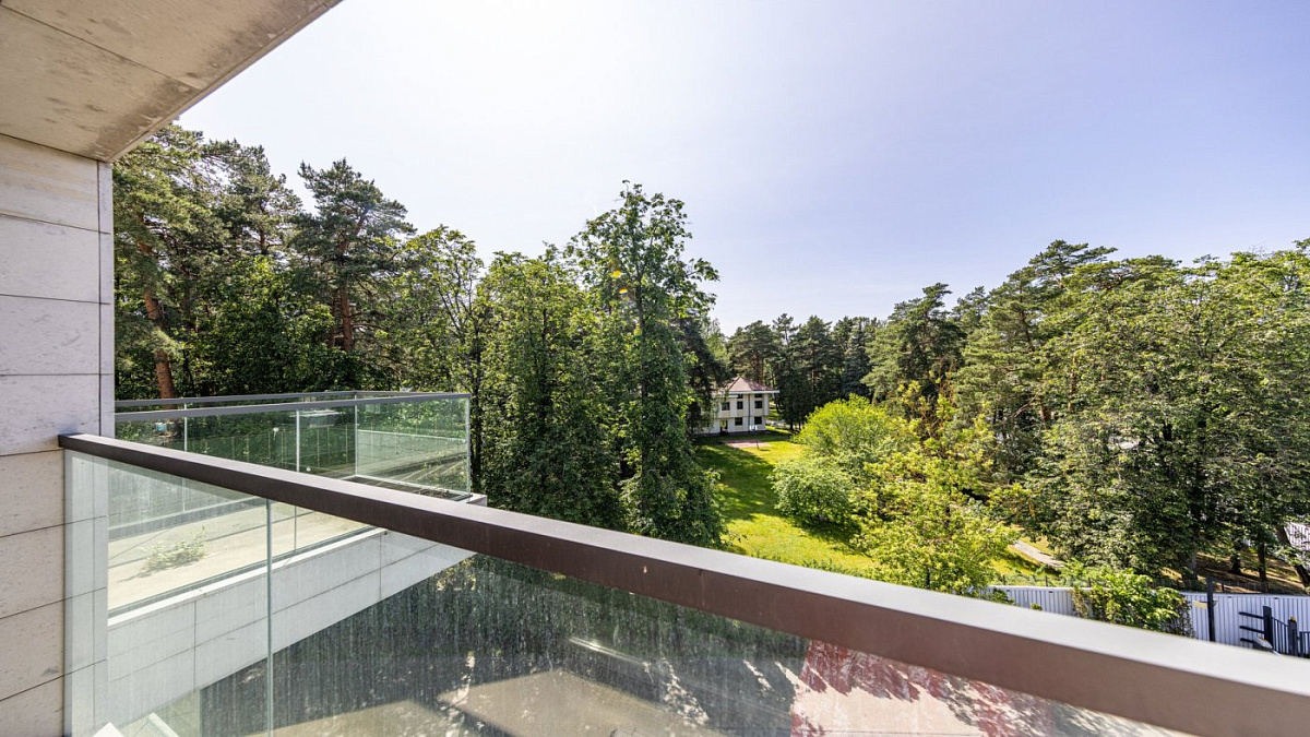 Планировка: прихожая, гардеробная, очень просторная кухня-гостиная с камином и пятью панорамными окнами, санузел, мастер-спальня с санузлом и большим балконом, гостевая спальня с балконом.