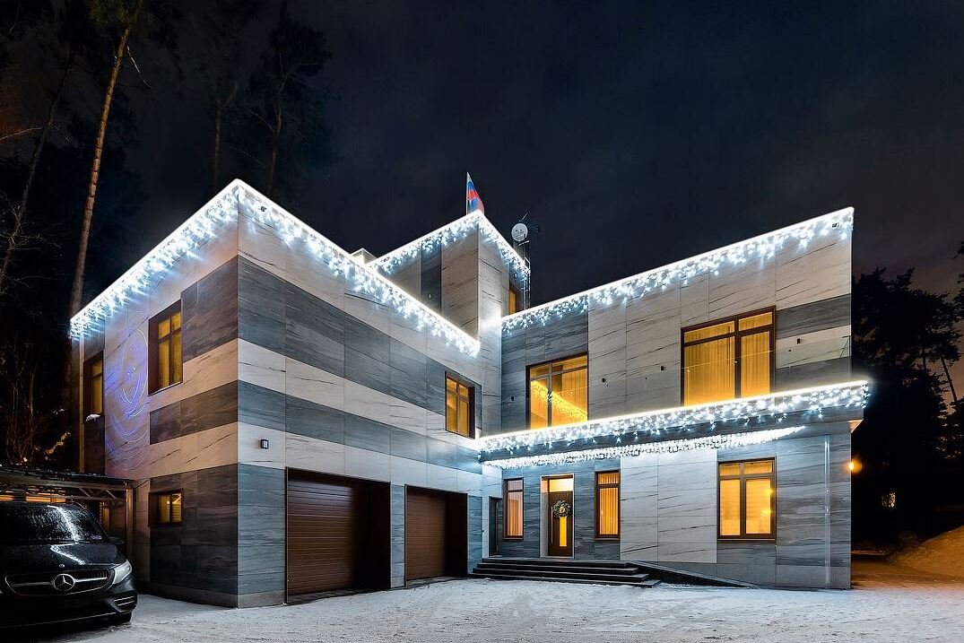 Её архитектура, выполненная в современном стиле, естественно вписывается в окружающий ландшафт. Объемно-кубическая прямолинейная компановка здания с плоской кровлей, построенного из экологически чистого красного кирпича, с навесным фасадом на нержавеющей подсистеме из итальянских большеформатных гранитно-керамических плит, комбинированных светло-бело-серых цветов, учитывает последние модные мировые тенденции загородного домостроения. Для украшения фасада смонтированы художественная и новогодняя динамическая подсветки.