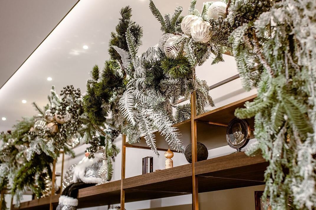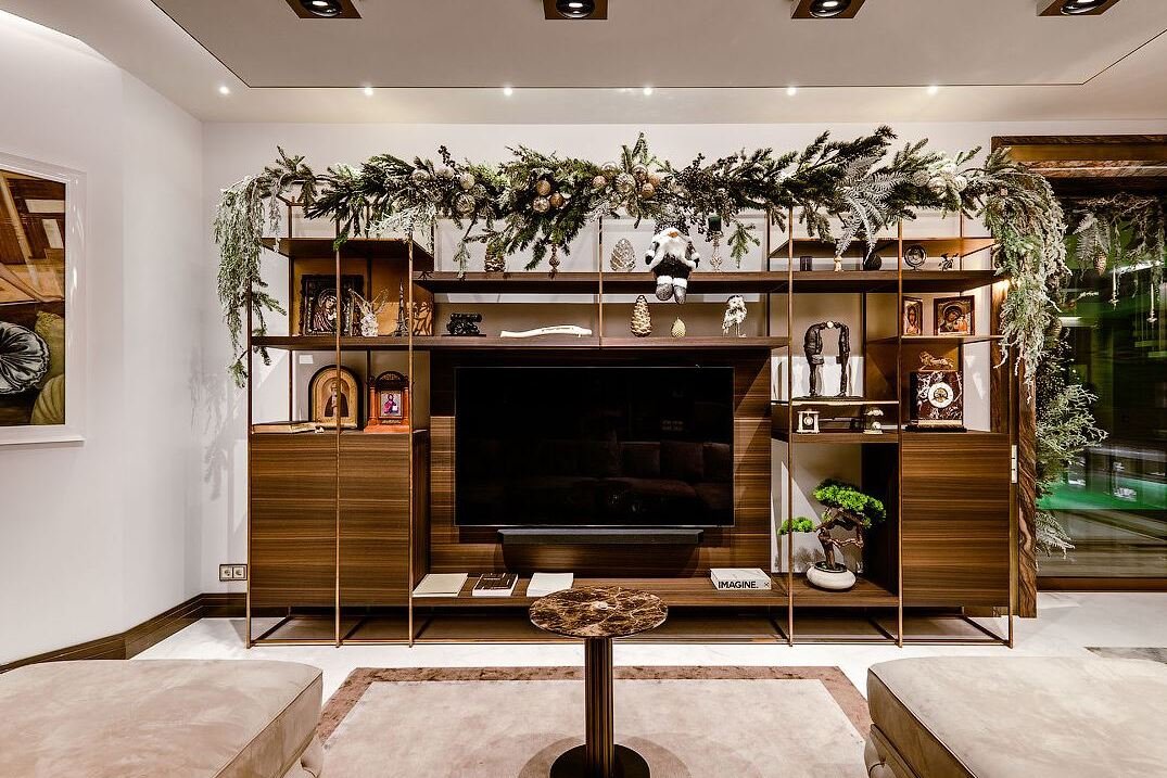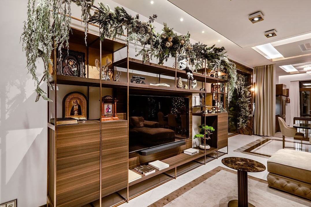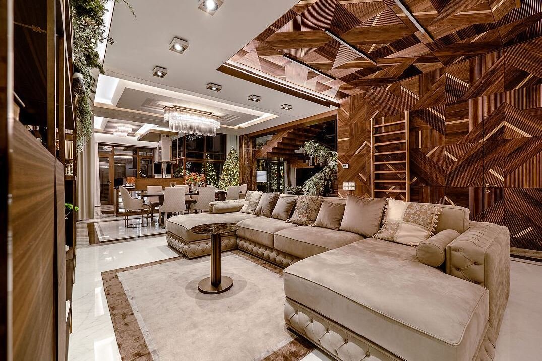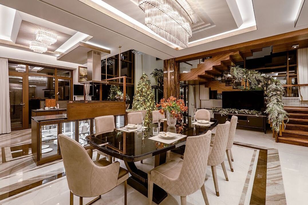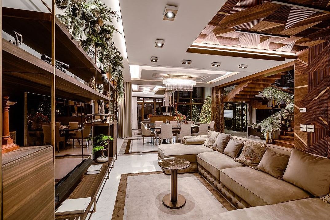 На первом этаже располагается гостиная, объединенная с обеденным залом и островной кухней-баром, а также зоной камина, что повышает функциональность внутреннего пространства в соответствии с актуальными модными тенденциями планирования современных интерьеров. Комфорт добавляют теплые полы, порталы и колонны из итальянского мрамора и многие стены, местами переходящие в потолок, обшитые индивидуально заказанными итальянскими панелями из массива американского ореха.