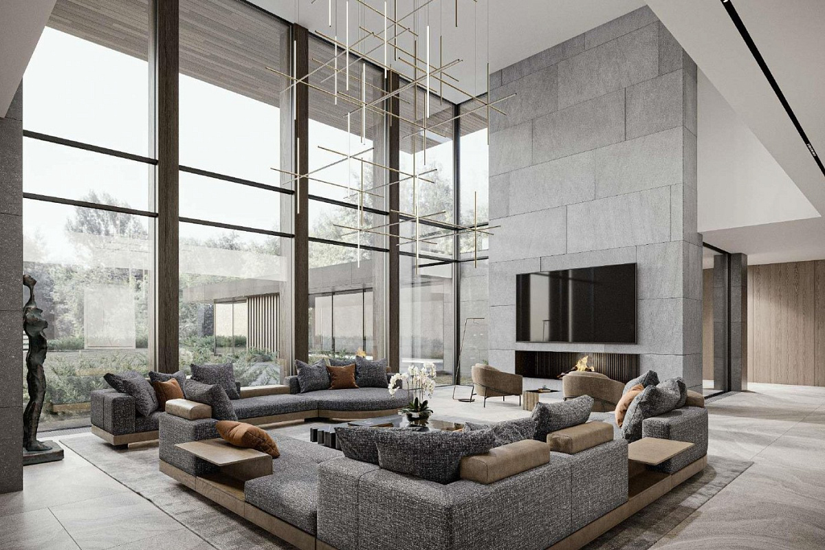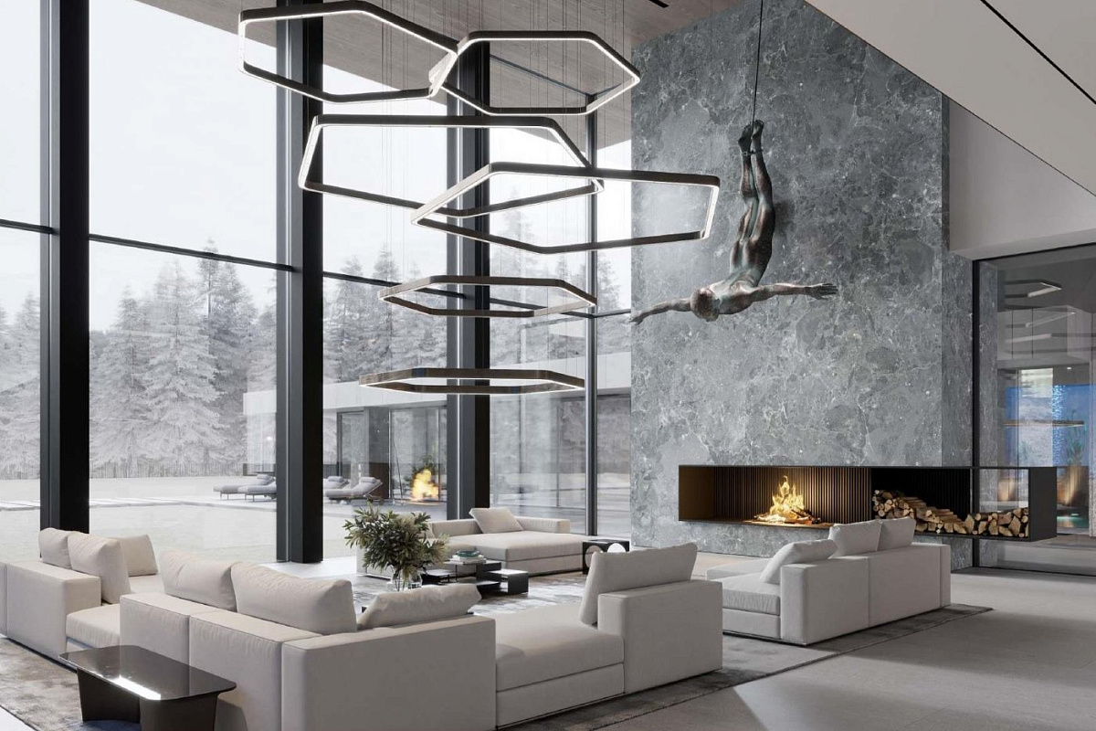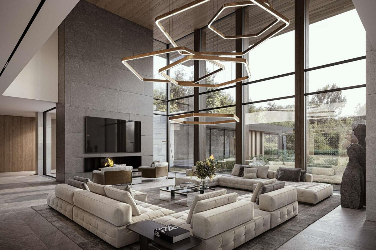 Два уровня, бассейн 15x5 м, SPA-зона, лифт, 5 спален с гардеробными и ванными комнатами, камин, обособленный блок персонала. Высокие потолки до 4,2 метра. Большое панорамное остекление со вторым светом. Парковка на 5 м/м.