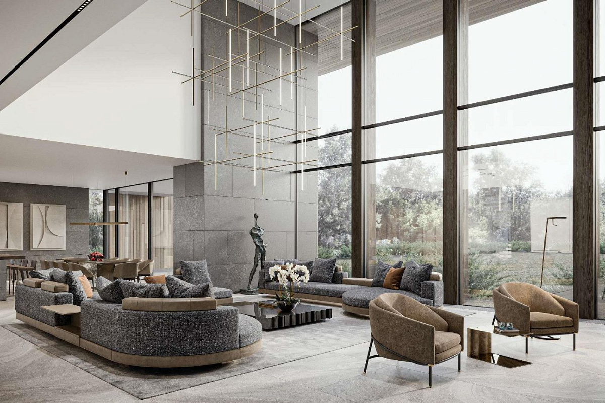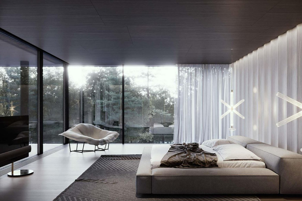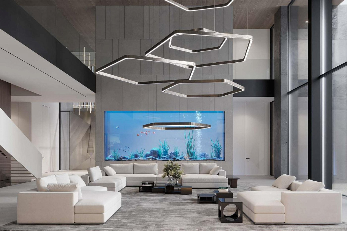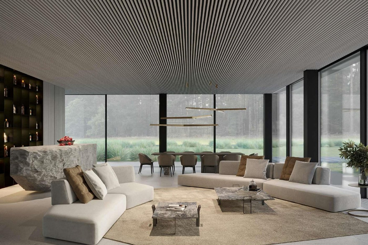 Два уровня, бассейн 15x5 м, SPA-зона, лифт, 5 спален с гардеробными и ванными комнатами, камин, обособленный блок персонала. Высокие потолки до 4,2 метра. Большое панорамное остекление со вторым светом. Парковка на 5 м/м.