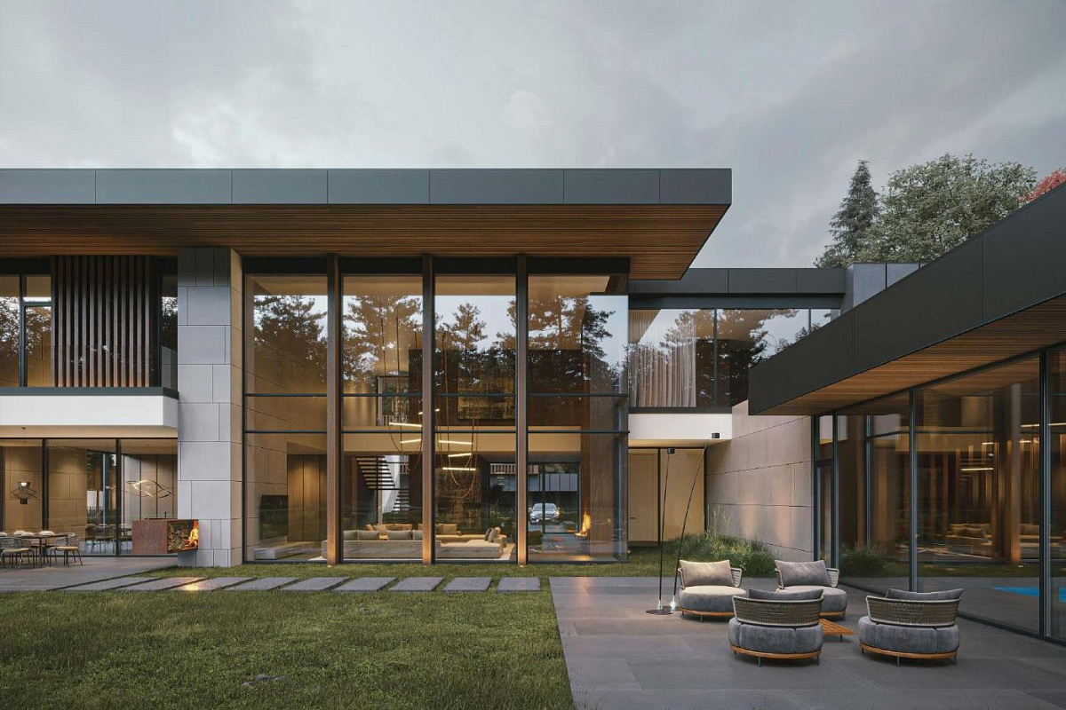 В концепции экстерьера выдержана четкая геометрия форм. Силуэт сочетает в себе строгие формы и притягательный уют. Цветовая гамма фасада из натурального Португальского камня и дерева идеально гармонирует с ландшафтом. А за открытость отвечает принцип его расположения на участке и единение с окружающей средой, а также панорамные окна по всему дому с уникальной раздвижной системой с максимально тонким алюминиевым профилем.