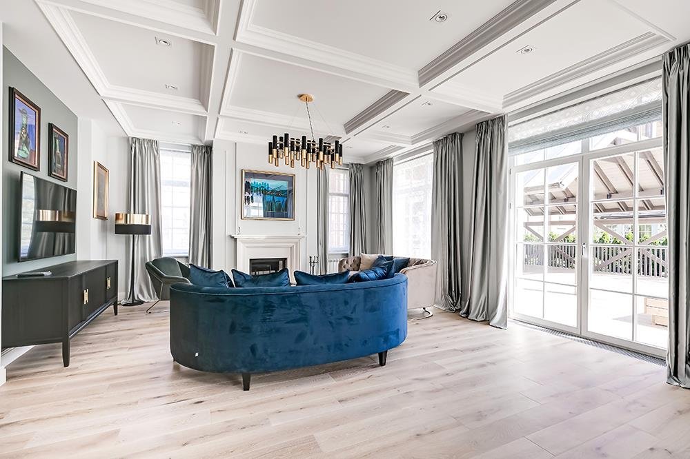 В планировке предусмотрено 4 спальни с ванными и гардеробными комнатами, просторный каминный зал, столовая, кухня, кабинет, сауна с комнатой отдыха и душевой. На участке проведены ландшафтные работы, отдельно расположены просторное патио с камином-мангалом и дом персонала (1 этаж: комната отдыха, сауна, душевая. 2 этаж: 2-комнатная квартира для персонала).