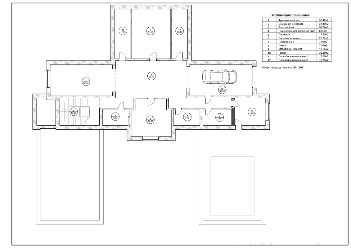 Цоколь: спальня с с/у и гардеробной, сауна, тренажерный зал, кинотеатр, винный погреб, косметический кабинет, гараж, автомойка, мастерская, постирочная, с/у, венткамера, тех.помещение под бассейном. Лифт.