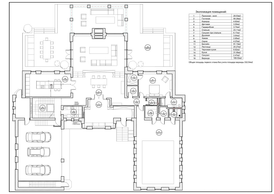 1 этаж: прихожая, гардеробная, холл, кухня – столовая, рабочая кухня, каминный зал с выходом на летнюю террасу с зоной барбекю (камин, обеденная зона, мини-кухня), спальня с с/у и гардеробной, кладовая, котельная, СПА зона: бассейн (10м), сауна, хамам, с/у, душевая.