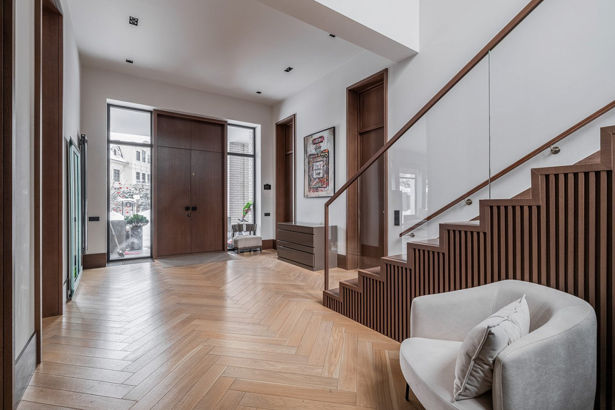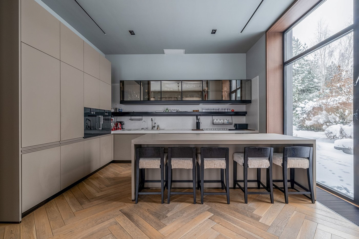 Первый этаж: холл, гардеробная, гостевой санузел, просторная гостиная-столовая с камином, кухня, кладовая, застекленная терраса. Гостевая спальня-кабинет с санузлом. СПА-зона: бассейн с выходом на участок, сауна, душевая, санузел. Блок для персонала: спальня, кухня, постирочная. Гараж на 2 автомобиля. Котельная с отдельным входом.
