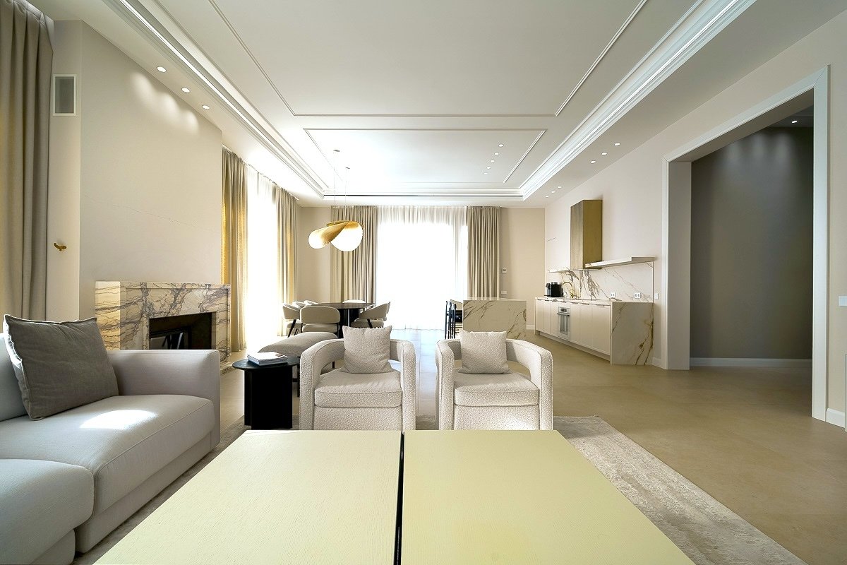 1 этаж: холл, гардеробная, гостевой санузел, гостиная с камином, кухня, столовая с выходом на террасу, кабинет, комната отдыха, сауна, комната персонала с отдельным входом, постирочная, бойлерная.