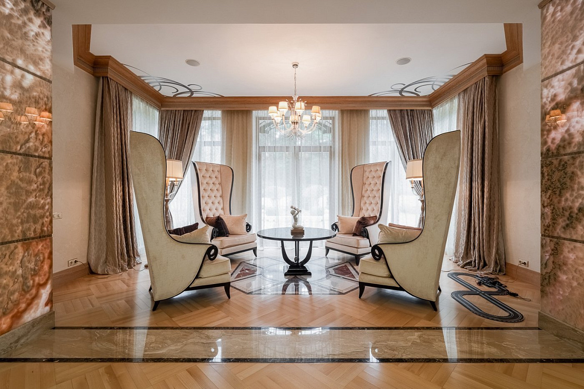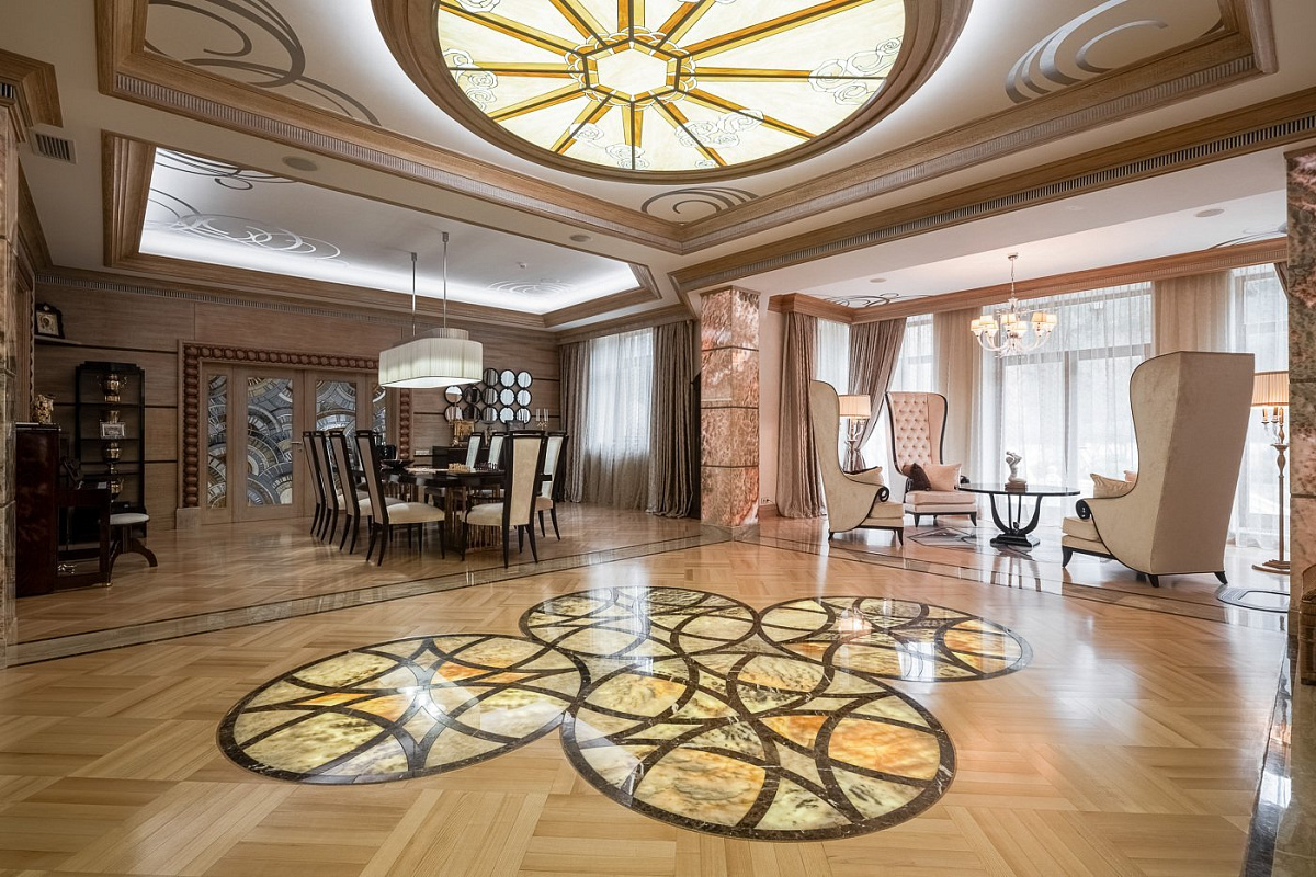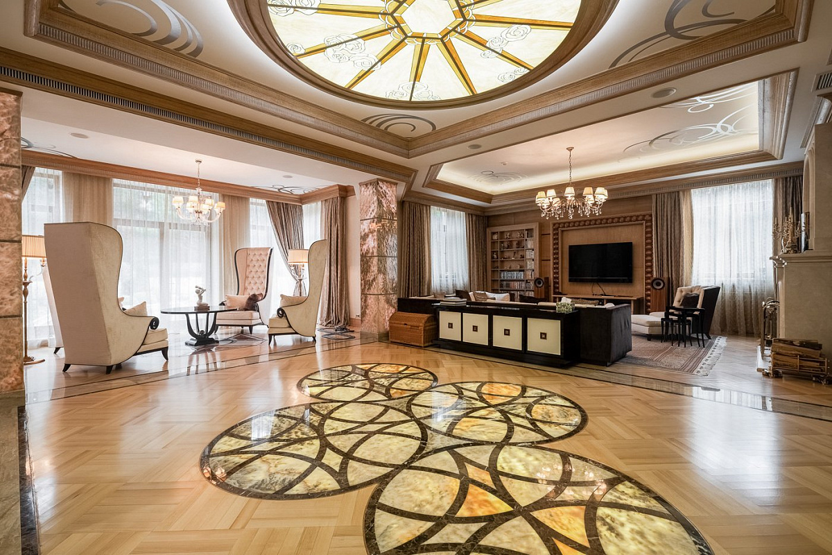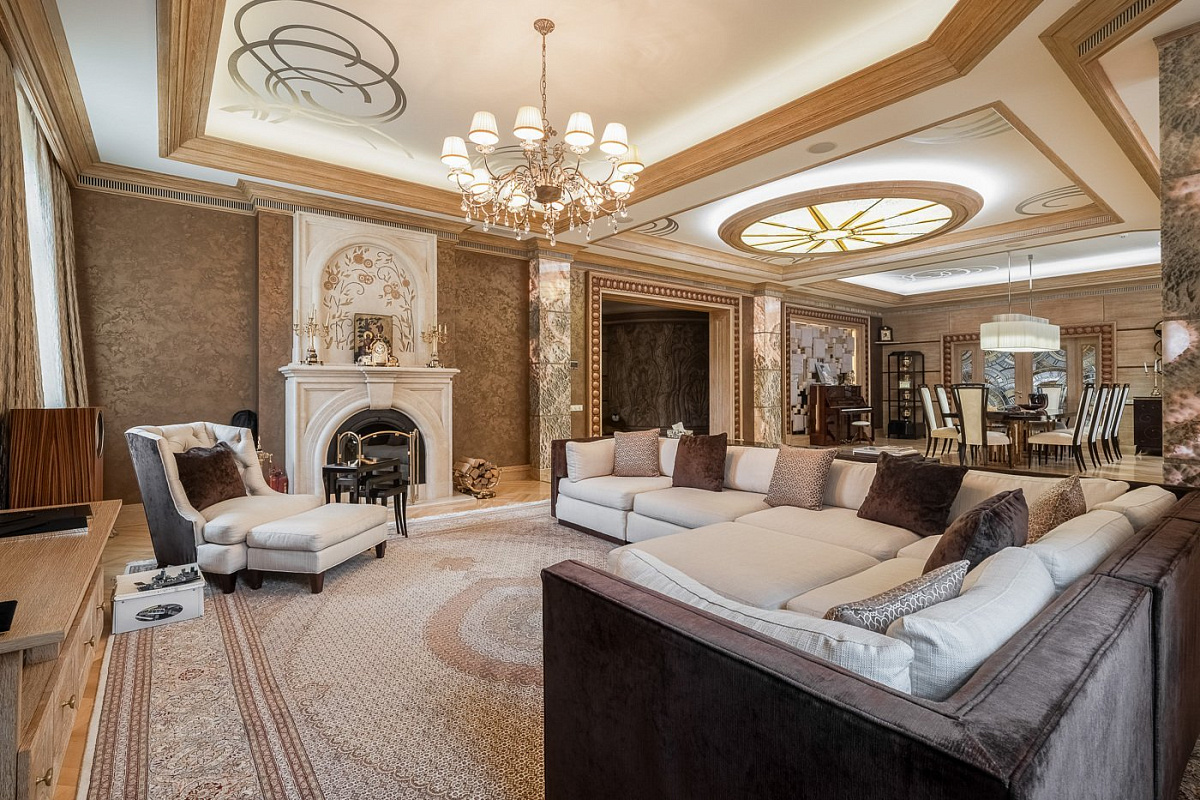 Цокольный этаж: кухня рабочая, бильярдный зал с камином, кинозал, винный погреб, 2 с/у, постирочная, массажная комната, тренажерный зал, с/у с душем, чемоданная комната;