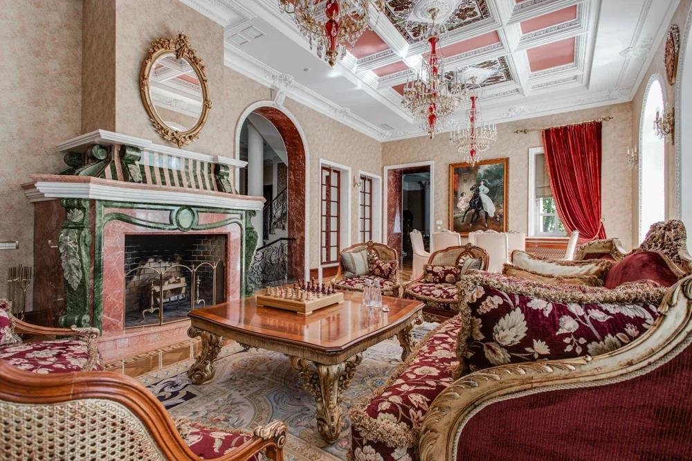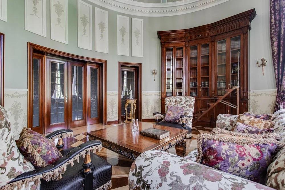 1 этаж: холл, санузел, гардеробная, диванная, гостиная 82 кв. м с камином, парадная столовая, малая столовая, кухня, гостевая спальня с ванной комнатой,