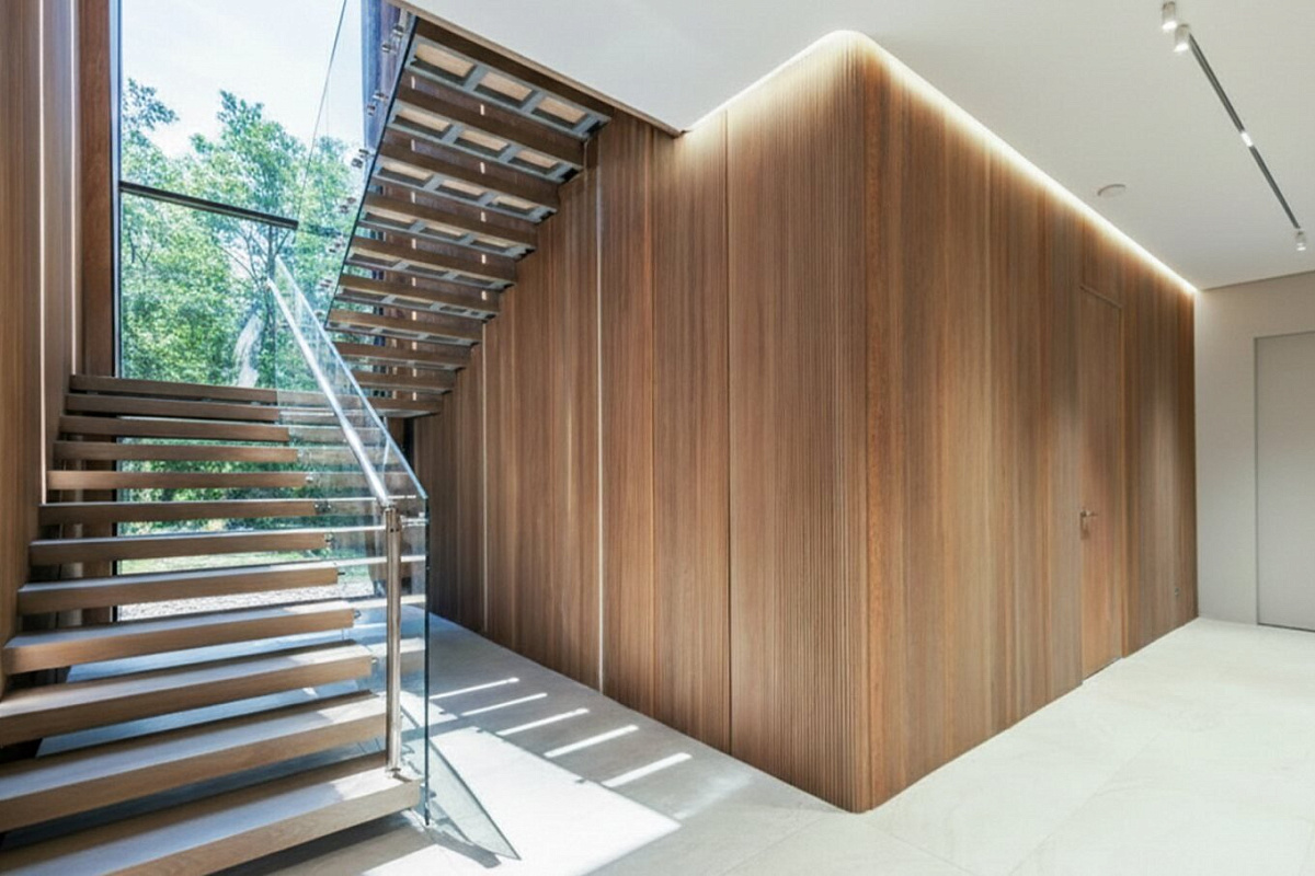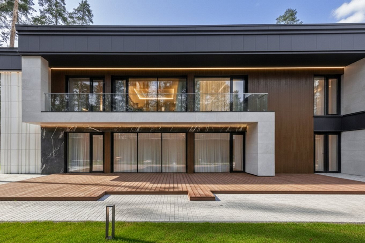 Загородный особняк площадью 1056 м² расположен на живописном лесном участке 13 соток. Архитектура здания притягивает взгляд: современный фасад, где гармонично сочетаются фактуры камня и дерева, в вечернее время эффектно подсвечивается, делая акцент на строгости линий. Панорамные окна наполняют внутренние пространства светом и открывают захватывающие виды на окружающий пейзаж.