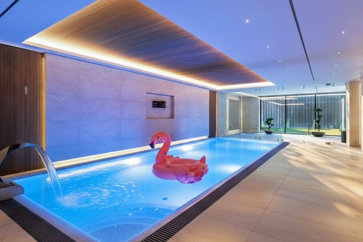 Центром притяжения стала большая гостиная с камином, плавно переходящая в просторную кухню-столовую с эргономичным гарнитуром Valcucine и функциональным островом. Для семьи и гостей предусмотрены четыре уютные спальни с гардеробными. Основным преимуществом является собственная СПА-зона с бассейном, сауной и спортзалом. Кроме того, в доме разместили помещения для персонала и встроенный гараж на два автомобиля.