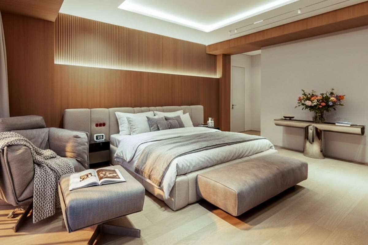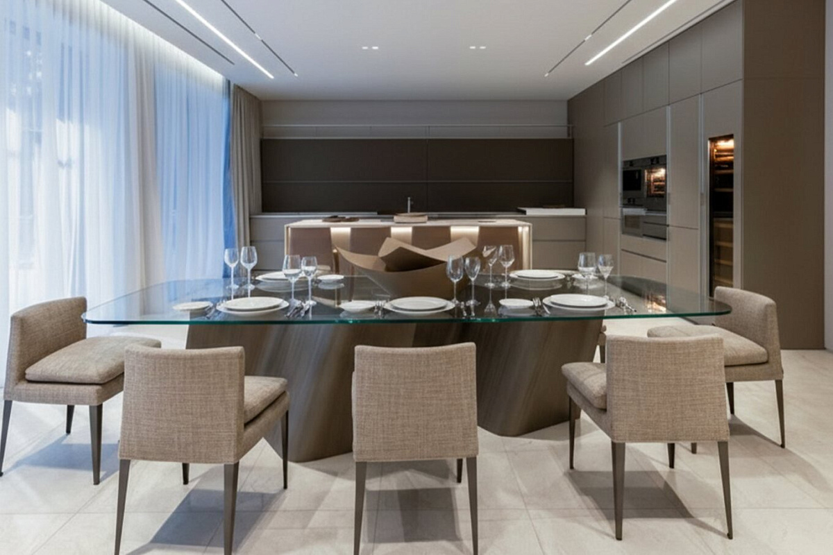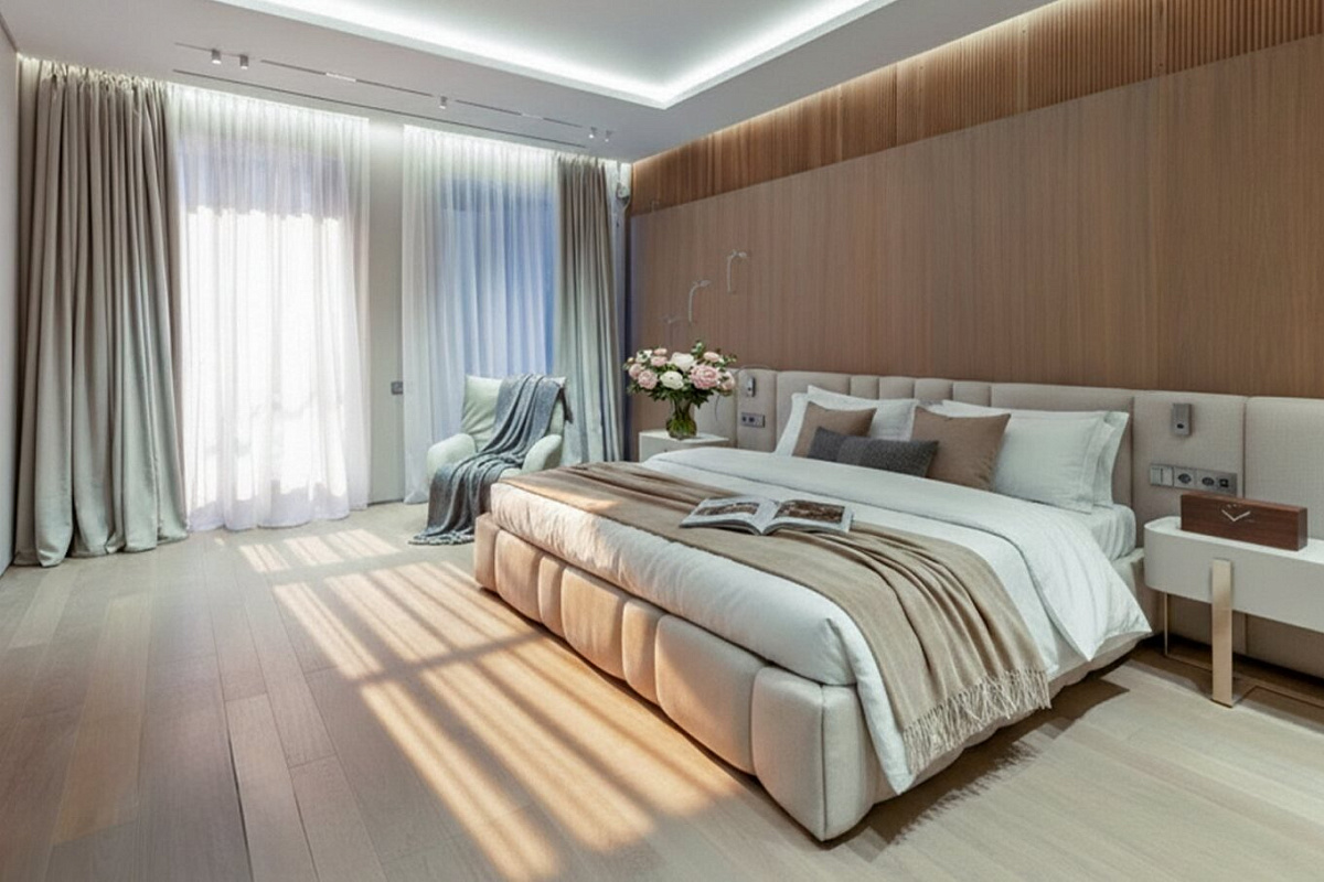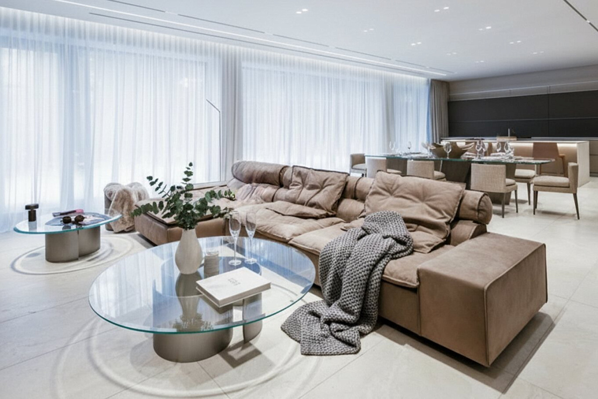 Внутри царит атмосфера утончённой роскоши — светлые и тёплые тона отделки, выполненные из высококачественных материалов, создают ощущение уюта и простора. Мебель Baxter, система подогрева полов, климат-контроль и приточно вытяжная вентиляция обеспечивают идеальный микроклимат в любое время года,